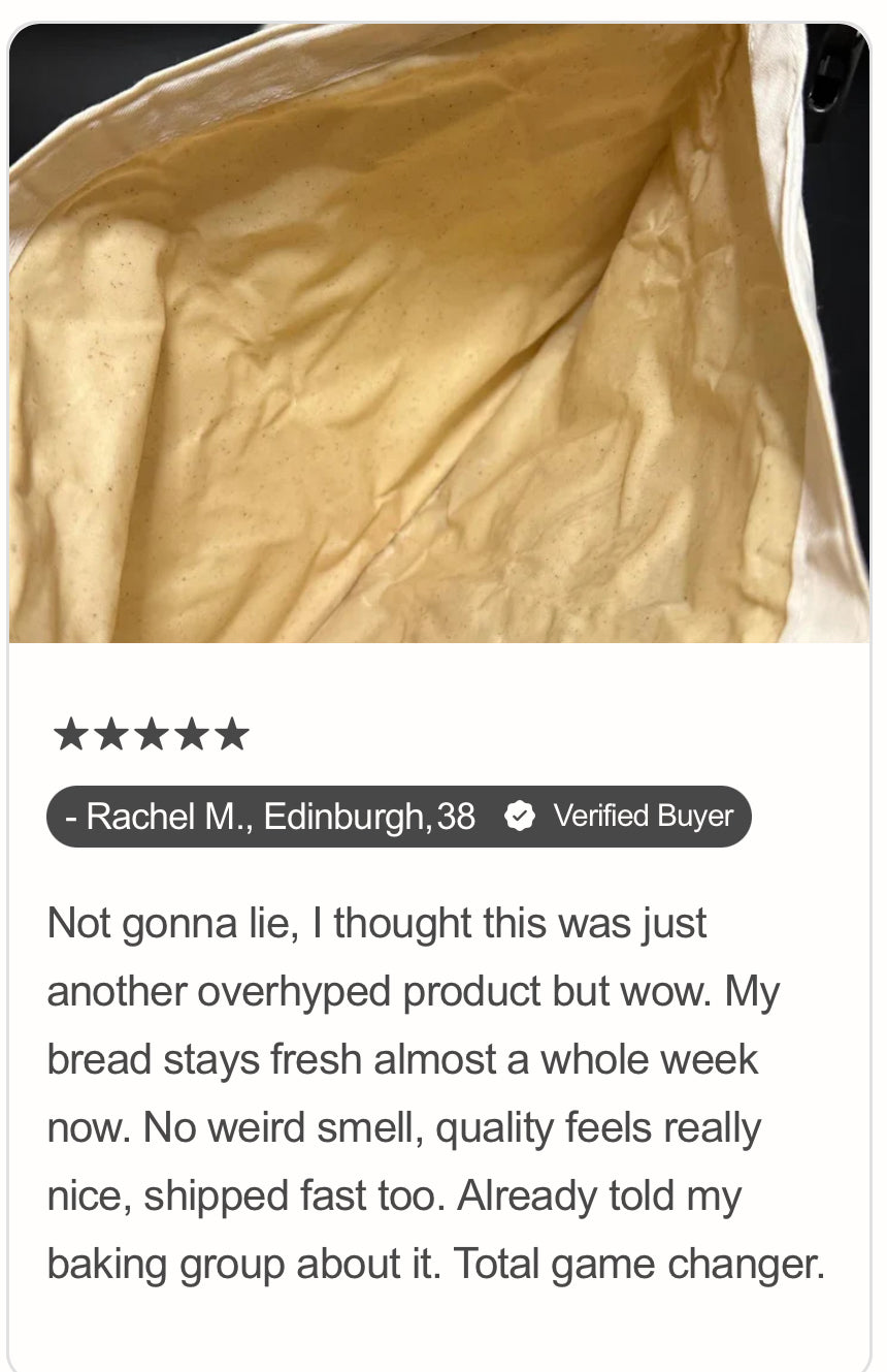 Each bag measures 33cm x 43cm (12” x 17”) — big enough for large sourdough boules, tin loaves, or two smaller loaves at once. No squishing, no cramming.